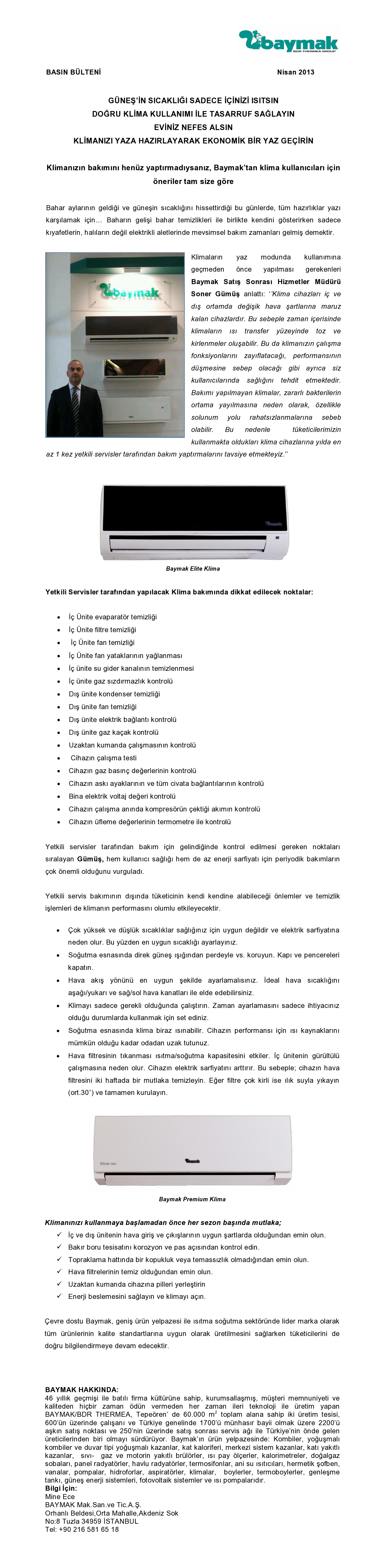 KLİMANIZ YAZA HAZIR MI? 01.04.2013 Baymak Basın Bülteni