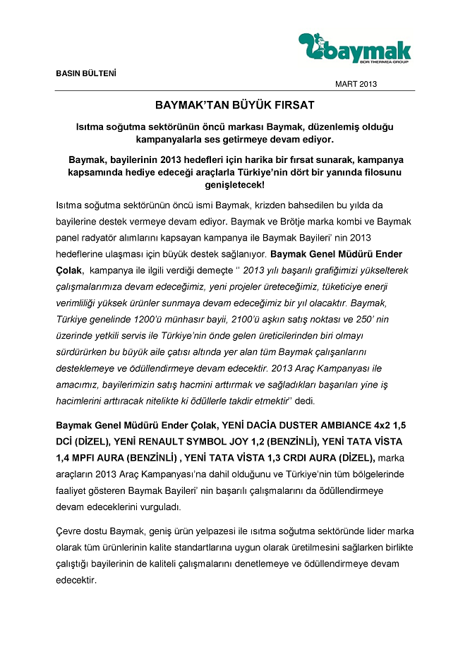 BAYMAK'TAN BÜYÜK FIRSAT! 01.03.2013 Baymak Basın Bülteni