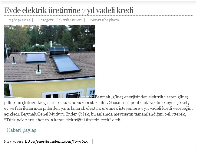 EVDE ELEKTRİK ÜRETİMİNE 7 YIL VADELİ KREDİ 03.09.2012 www.enerjigundemi.com Ana Sayfa