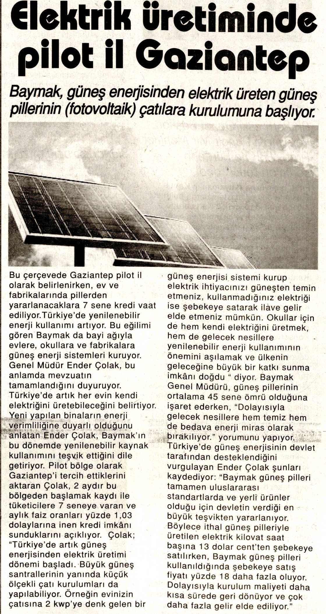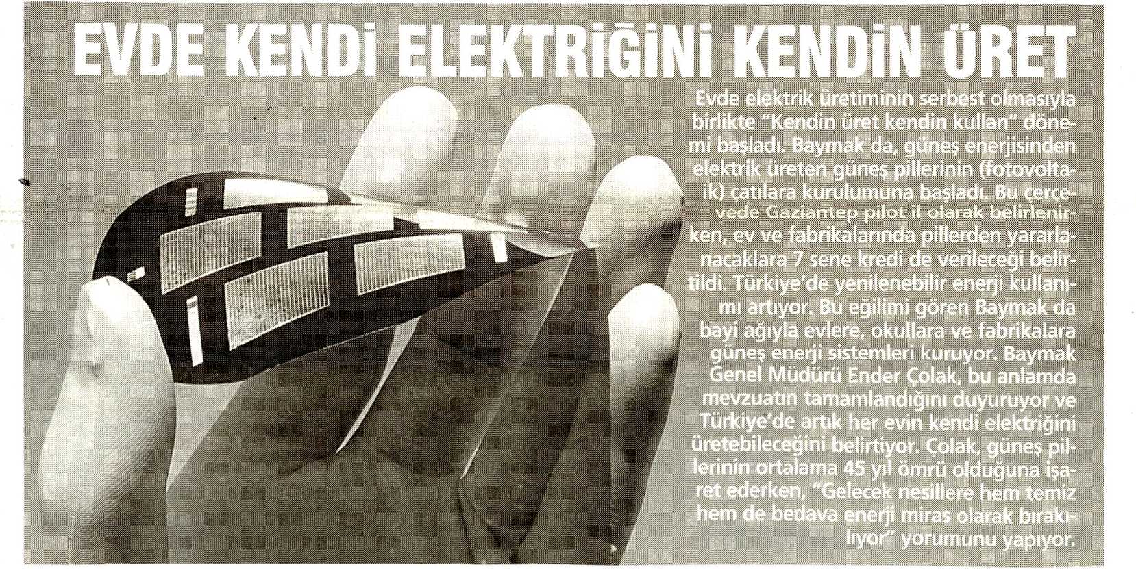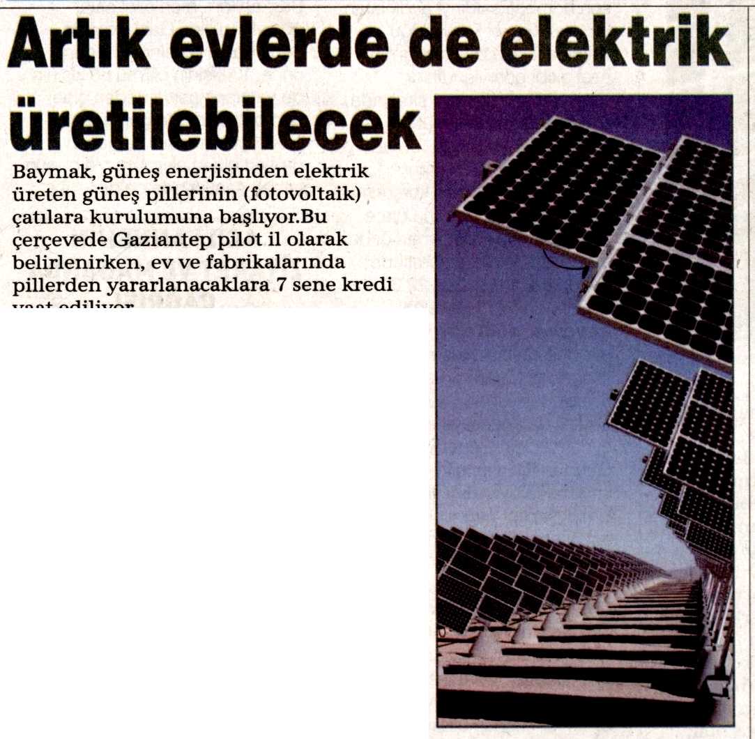ARTIK EVLERDE DE ELEKTRİK ÜRETİLEBİLECEK 01.09.2012 Haber Gazetesi (Gaziantep)
