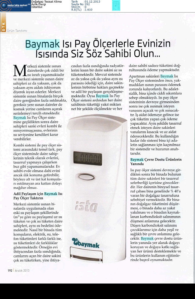 BAYMAK ISI PAY ÖLÇERLERLE EVİNİZİN ISISINDA SİZ SÖZ SAHİBİ OLUN... 01.12.2013 Doğalgaz Tesisat Klima