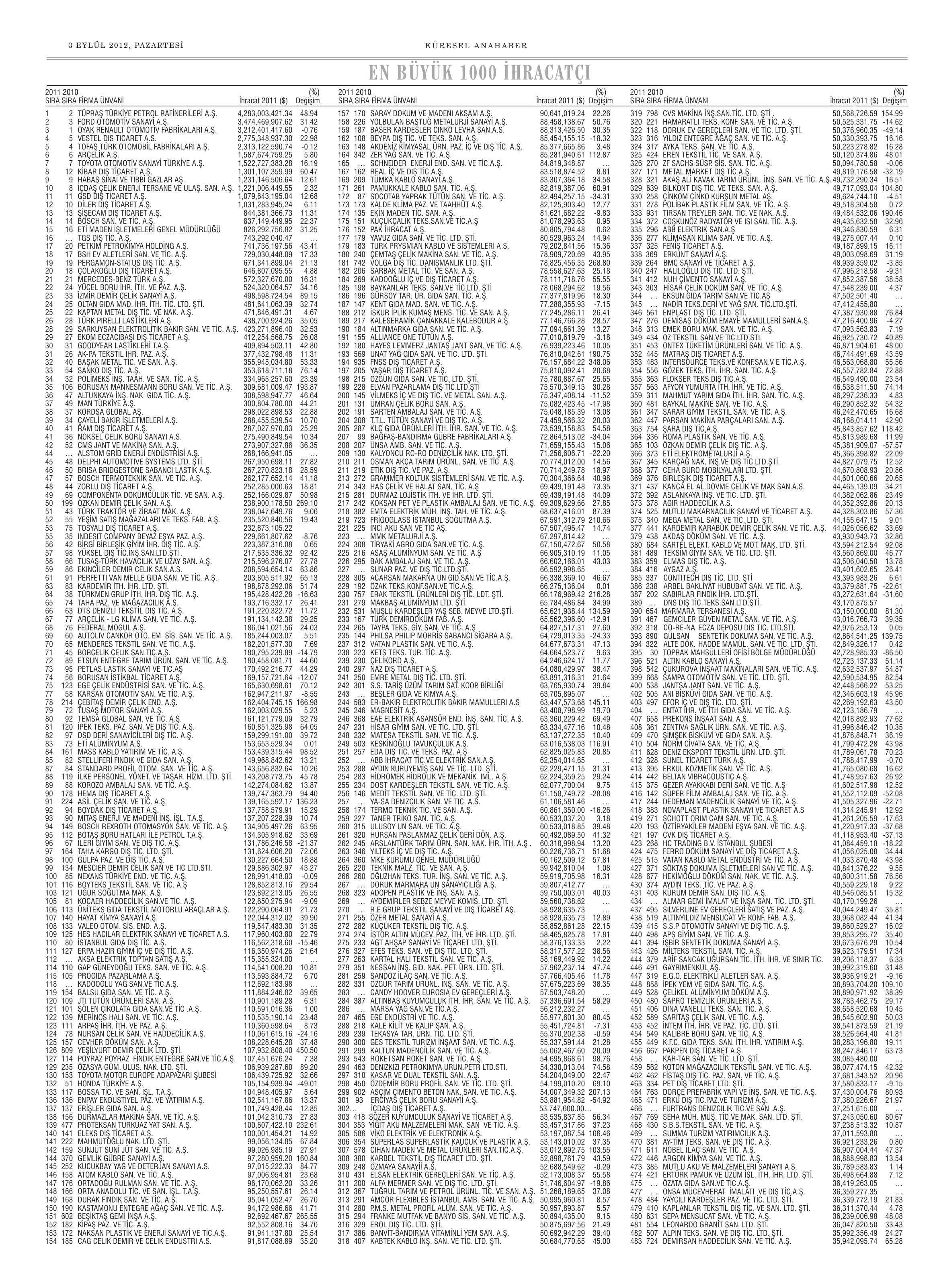 EN BÜYÜK 1000 İHRACATÇI 03.09.2012 Küresel Ana Haber
