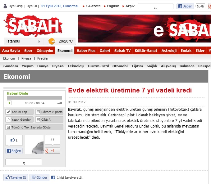 ARTIK EVLERDE DE ELEKTRİK ÜRETİLEBİLECEK 01.09.2012 Haber Gazetesi (Gaziantep)