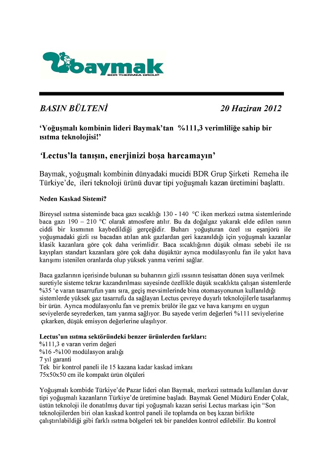 Yoğuşmalı kombinin lideri Baymak’tan %111,3 verimlilik! 20.06.2012 Baymak Basın Bülteni