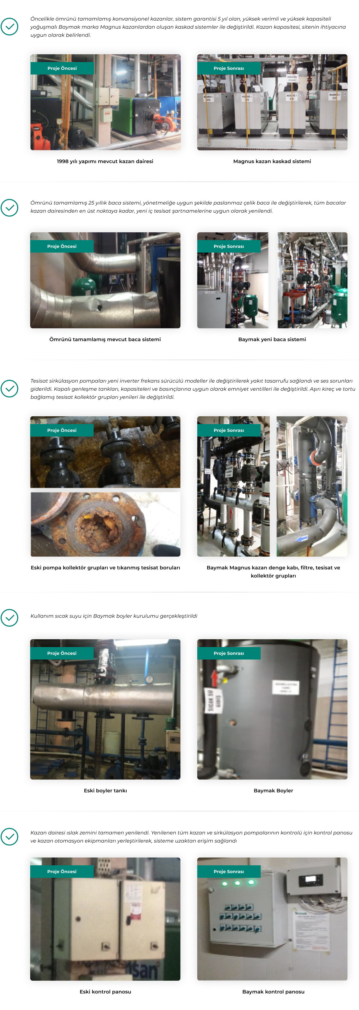 Bu proje, tüm kazan, pompa, baca, boyler ve tesisat sistemini yenileyerek kapsamlı olarak çözüm sağladığımız bir projedir.